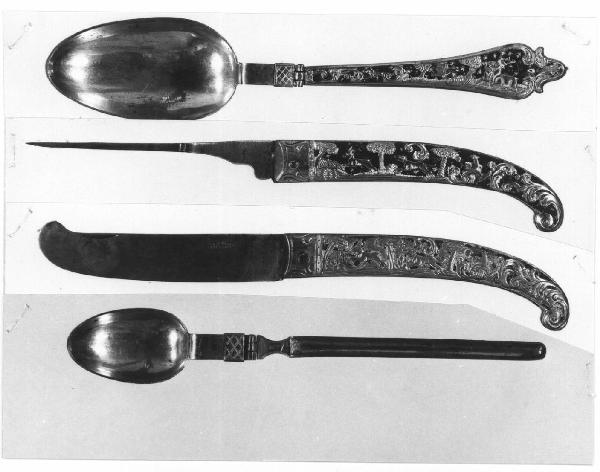 - NOTIZIE STORICO CRITICHE Rispetto al cucchiaio e alla forchetta, con i quali questo coltello compone il servizio da viaggio, sono riscontrabili notevoli differenze stilistiche nella resa degli animali e della vegetazione sul manico, in una composizione più affollata e dinamica