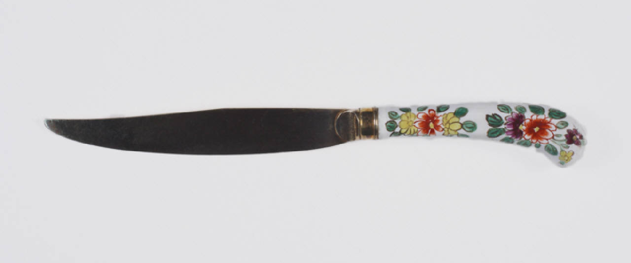 - NOTIZIE STORICO CRITICHE Non è identificato il punzone impresso sulla lama di tre coltelli. I manici non sono di produzione uniforme: quattro sono di Doccia della metà del XVIII secolo, tre, corrispondenti ai coltelli punzonati, sono ottocenteschi, mentre gli altri cinque sono stati probabilmente ridecorati nel XX secolo (Tasso-Perin, 2003). Anche le lame presentano lievi differenze.