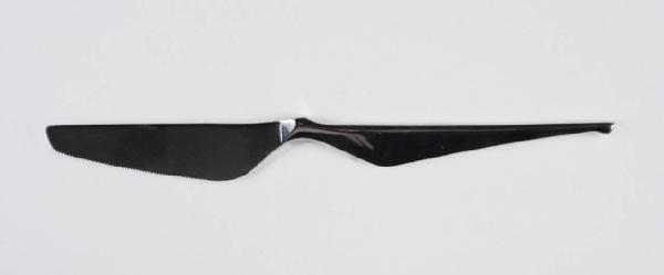 Coltello da tavola in acciaio, liscio: lama a costola dritta, tagliente accentuatamente curvo e punta arrotondata. Manico sagomato dal profilo asimmetrico, stretto alla base e sottilissimo all'estremità, con un lato dritto, in linea con la costola della lama, e un lato curvilineo