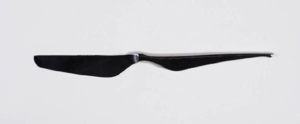 - NOTIZIE STORICO CRITICHE Il coltello da tavola fa parte del servizio denominato "Ergonomica", in acciaio inossidabile, disegnato nel 1990 per la ditta di Lumezzane (Bs) MEPRA (acronimo di "Metallurgica Prandelli") da Angelo Mangiarotti che vinse per questo progetto il Premio Design Plus nel 1991. La qualità scultorea del coltello, ricavata da un attento studio della funzionalità, è evidente nella sagoma elegante del manico e nel corrispondersi della curva di quest'ultimo con quella della lama. M. Romanelli inserisce giustamente le posate "Ergonomica" nella categoria delle "posate disegnate" (2001) proprio per la accurata ricerca formale che le contraddistingue