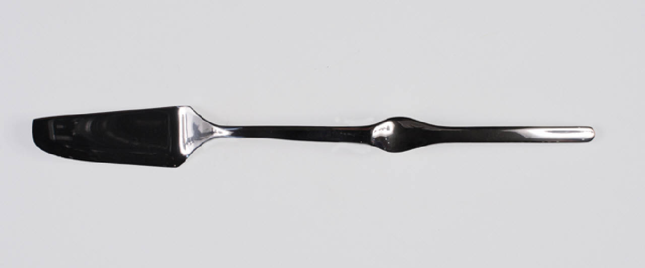 - NOTIZIE STORICO CRITICHE Il coltello fa parte del servizio denominato "Ergonomica", in acciaio inossidabile, disegnato nel 1990 per la ditta di Lumezzane (Bs) MEPRA (acronimo di "Metallurgica Prandelli") da Angelo Mangiarotti che vinse per questo progetto il Premio Design Plus nel 1991. L' espansione concava al centro del manico ricavata da un attento studio della funzionalità, conferisce alla posata un'indubbia qualità scultorea. M. Romanelli inserisce giustamente le posate "Ergonomica" nella categoria delle "posate disegnate" (2001) proprio per la accurata ricerca formale che le contraddistingue
