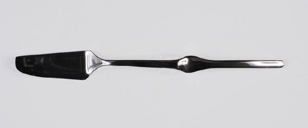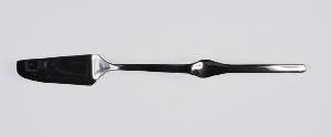 Coltello per dolce in acciaio, liscio, con lungo manico a bacchetta centrato da espansione ovoidale concava