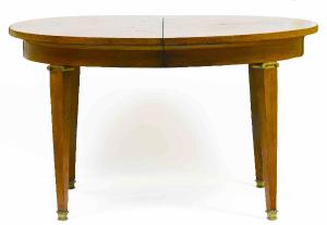 Tavolo da pranzo ovale su quattro gambe a sezione quadrata rastremate verso il basso.