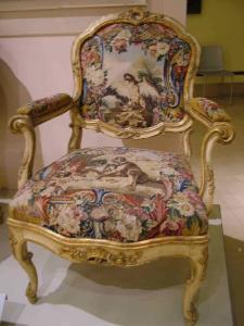 Poltrone con schienale dalla forma ampia e dilatata; sedili, spalliera e braccioli imbottiti e rivestiti con arazzo di Beauvais.