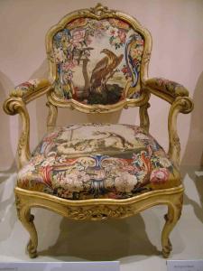 Poltrone con schienale dalla forma ampia e dilatata; sedili, spalliera e braccioli imbottiti e rivestiti con arazzo di Beauvais.