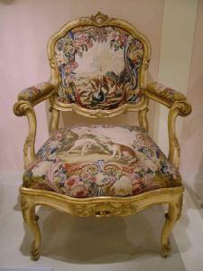 Poltrone con schienale dalla forma ampia e dilatata; sedili, spalliera e braccioli imbottiti e rivestiti con arazzo di Beauvais.