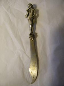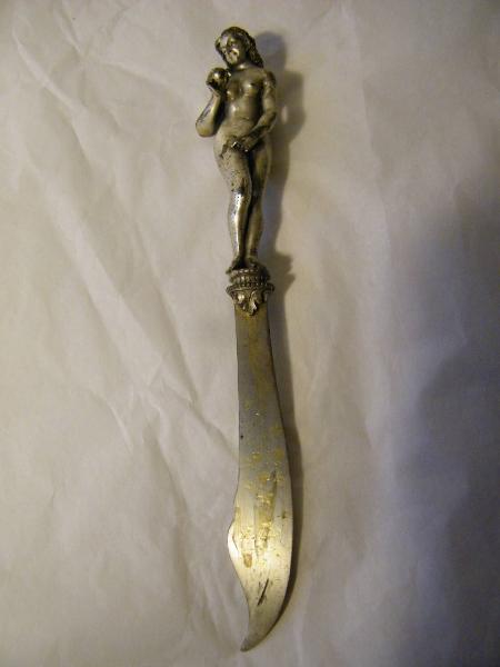 Il manico, in stagno cesellato e argentato, è rappresentato dalla figura di Eva con il capo leggermente reclinato ad osservare la mela mentre poggia sul bottone, ovvero un capitello che ha per base due foglie contrapposte. Da qui segue sulla lama, in ferro cesellata e argentata dalla costa non rettilinea e rivolta rispetto il fronte della raffigurazione del manico alla sinistra dell'osservatore, un abbozzo di motivi floreali e nello slargo il monogramma del committente, mentre sul retro, sotto il bottone, è presente l'iscrizione in lettere capitali "eva".