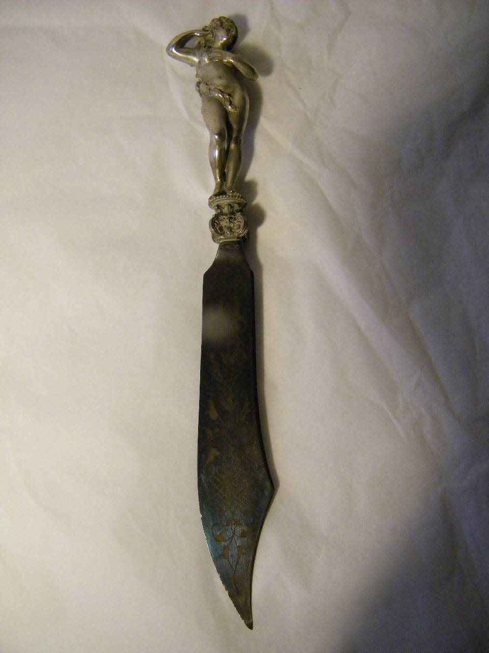 Il manico, in stagno cesellato e argentato, è rappresentato da una figura femminile nuda dai lunghi capelli che, dalla schiena, scendono lungo il corpo e l'avvolgono arrivando a coprire il ventre. La mano sinistra sfiora i seni mentre quella destra, appoggiata alla base della nuca, è tra i capelli. La figura, rappresentata in un atteggiamento di vanità sebbene manchi in questo caso l'iscrizione esplicativa, poggia su di un bottone caratterizzato da un capitello formato da quattro mascheroni. Qui la lama, in ferro cesellata e argentata, è lavorata su entrambi i lati con arabeschi, ageminati in oro e bruniti, e la costa non rettilinea è rivolta, rispetto il fronte della raffigurazione del manico, alla sinistra dell'osservatore.