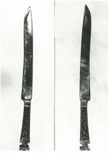 Coltello da tavola, simile al precedente, con manico niellato a racemi, mezza figura di uomo di profilo a destra e di donna di profilo a sinsitra con scritte amatorie. Il manico è profilato in metallo dorato e termina con una specie di palmetta della stessa materia.