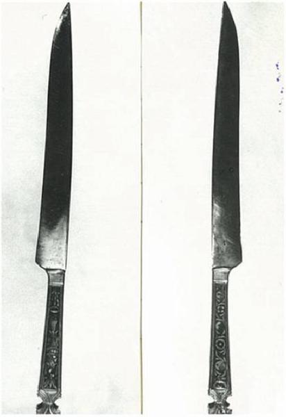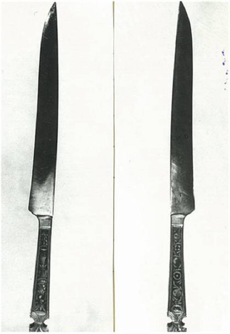 Coltello da tavola, simile al precedente, con manico niellato a girali vegetali, fiori e frutti.