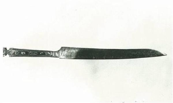 Coltello da tavola, simile al precedente, sulle facce decorazioni floreali e due teste.
