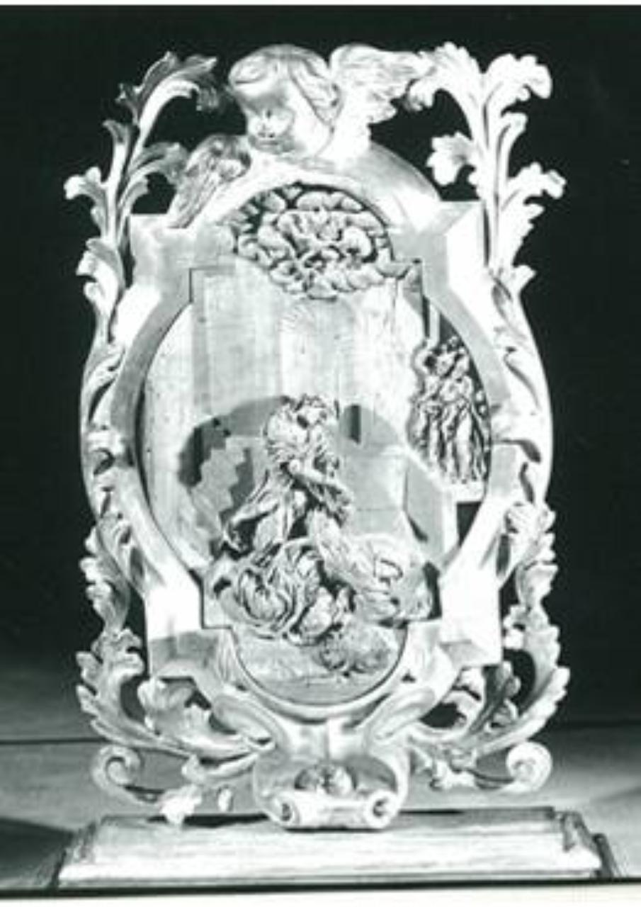 Altorilievo in legno policromo di forma ellittica e racchiuso entro una cornice dorata a fogliami, sormontata da una testa di cherubino. Al centro viene rappresentato il martirio di San Giovanni Battista; sulla destra nel gruppo di coloro che assistono alla scena è raffigurato Erode con il capo incoronato mentre dall'alto un angelo esce dalle nubi reggendo tra le mani la corona e la palma del martirio. Sullo sfondo si profila una nicchia vuota e a sinistra una scalinata.