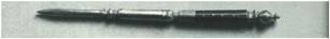Passacorda per cucire la pelle. Manico il legno, con pomolo e applicazioni in metallo a girali incise su fondo dorato.