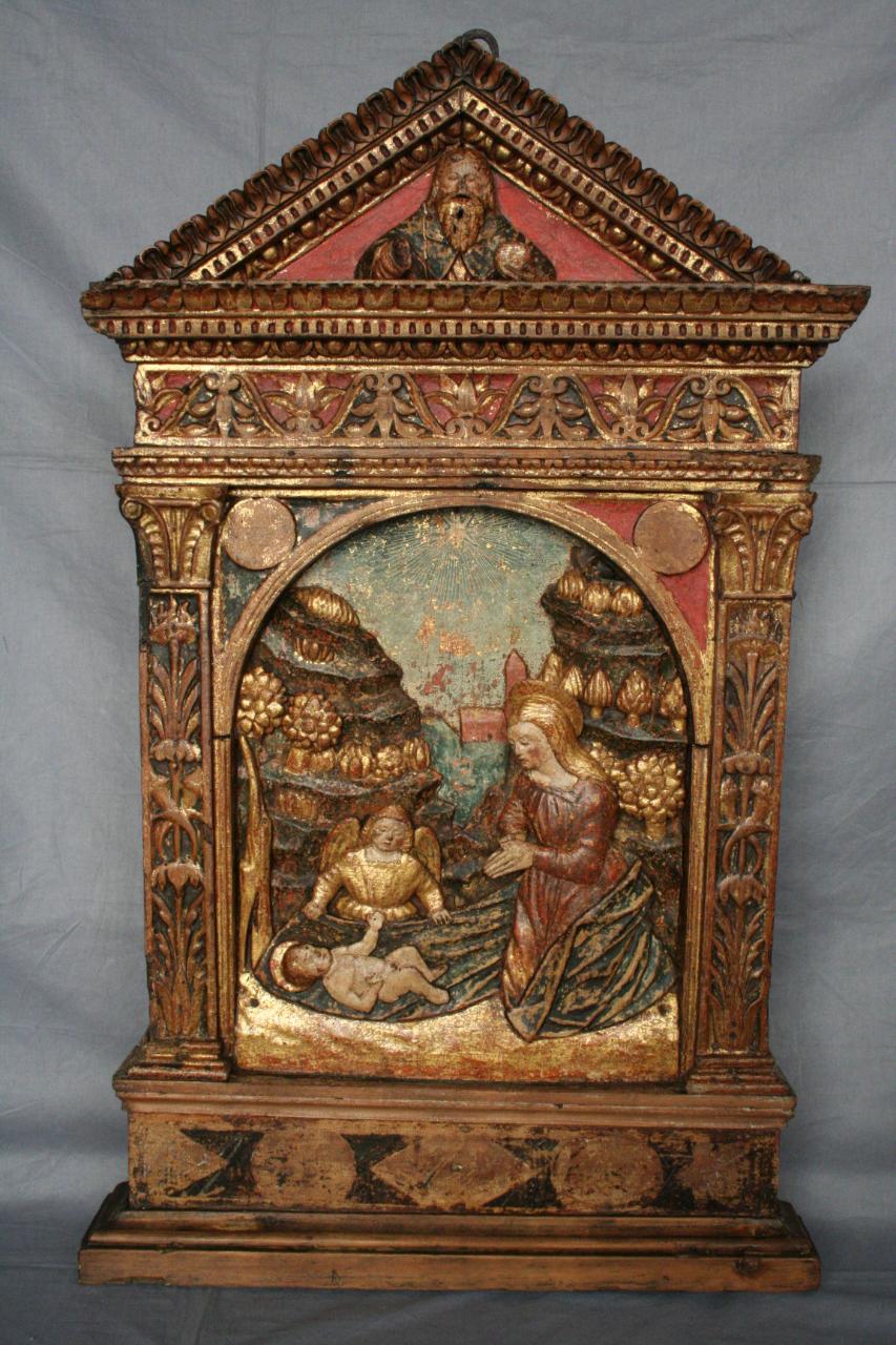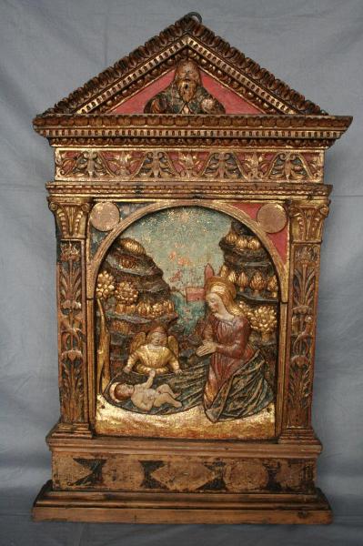 Piccola ancona intagliata con l'Adorazione del Bambino. La Madonna è in ginocchio e adora il Bambino, poggiato su un lembo di stoffa sorretto da un angelo. La composizione è inserita in una cornice terminante in alto con un timpano nel quale vi è la rappresentazione del Padre Eterno.