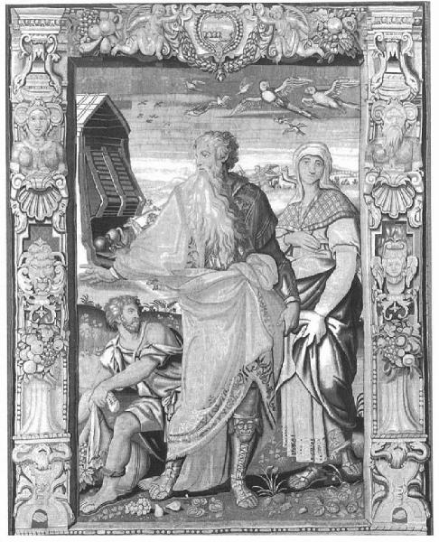 - NOTIZIE STORICO CRITICHE Questo arazzo è una copia parziale (viste le ridotte dimensioni) dell'Imbarco degli animali disegnato di Coxcie per la serie delle Storie di Noè commissionate da Sigismondo Augusto di Polonia (Cracovia, Castello di Wawel). La composizione dell'arazzo milanese è ridotta a sole tre figure. Invenzioni del cartonista furono esclusivamente i due pappagalli (di fattura assolutamente non pregevole) che volano sopra Noè. Questa contrazione dal modello di Cracovia ha provocato alcune incongruenze figurative, ravvisabili sopratutto nelle figure di Noè e del figlio. Nella nuova redazione, la figura di Noè è divenuto il centro della raffigurazione, mentre quella del figlio è fortemente ridimensionata e inserita nello spazio lasciato libero dal braccio alzato del padre. Una medesima soluzione è rilevata nella copia dell'Imbarco della Cattedrale di Cuenca, tessuta nel 1658.