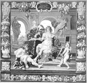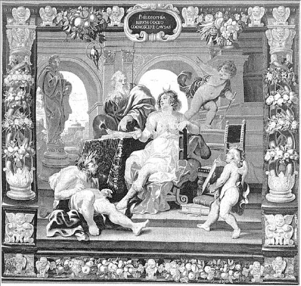 - NOTIZIE STORICO CRITICHE Dal momento che l'arazzo è una copia in controparte dell'incisione "Dialettica" di Cornelius Shut, è più corretto attribuire all'arazzo il nome di Dialettica piuttosto che quello di Filosofia, come scritto nella didascalia. Gli attributi o simboli che compaiono nell'arazzo (pappagallo e cimiero a forma di mezzaluna) sono generalmente attribuiti alla Dialettica e all'Eloquenza. \nIl personaggio coronato di alloro probabilmente è Socrate in quanto compare con la fisionomia tramandata dall'epoca ellenistica e già riprodotta da Raffaello nella Scuola di Atene della Stanza della Segnatura. C'è il sospetto che il personaggio assiso vicino alla Dialettica possa essere identificabile con Platone, a completare la triade dei filosofi. \nDello stesso cartone sono note sette repliche (Essen, Roma, Cordova, Castrojerez, Santo Domingo, Bruges, Berlino, Zamora).