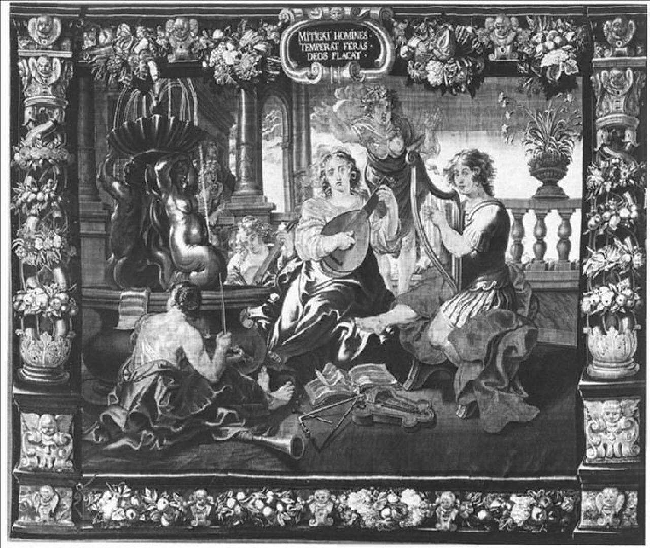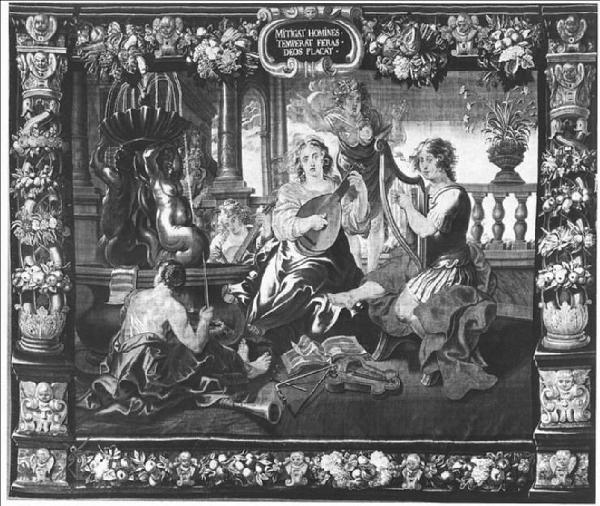 - NOTIZIE STORICO CRITICHE In questo arazzo, come nell'arazzo della Grammatica, piuttosto che una rappresentazione allegorica, sembra di trovarsi di fronte ad una scena realista, tratta dalla realtà. Tuttavia non mancano colte allusioni: il giovane abbigliato con un'armatura potrebbe essere Davide o Orfeo (con evidenti riferimenti all'ambito musicale). La sirena scolpita nella fontana alluderebbe alla dolcezza del canto. \nAltre colte citazioni erano previste dallo Shut se si osserva l'incisione di cui questo arazzo è copia, con alcune varianti: nell'arazzo è aggiunto un quarto suonatore (il violoncellista); i fiori raccolti nel vaso posto sulla balaustra nel'incisione sono narcisi e non garofani; la figura femminile appoggiata alla balaustra è alata nella stampa dello Shut. Probabilmente era immagine di Eco, ninfa amata da Narciso, condannata a ripetere ciò che le viene detto. Il fatto che nell'arazzo non ci siano narcisi ma garofani e che la figura femminile appoggiata alla balaustra non sia alata, fa perdere la colta citazione mitologica. \nSono note sei repliche del cartone.