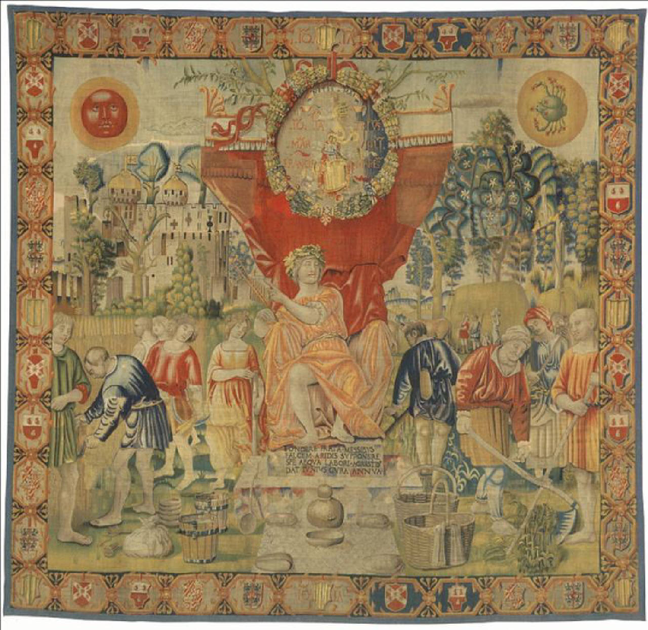 La personificazione del mese è un giovane vestito con una veste color arancio, seduto su un trono sotto l'ombra di un baldacchino. Ha la testa coronata da un serto di quercia e indica il sole con una verga a due punte. Il baldacchino sembra addossato ad un albero (quercia o ulivo). Il trono poggia su un basamento a due gradini. Sul primo di essi vi è l'iscrizione descrittiva del mese di Giugno. In primo piano vi sono diversi oggetti e alimenti: quattro pani, una zucca , alcune ciotole, un mestolo, due secchi, due cesti, un fagotto e dei cucchiai. A sinistra della personificazione vi è un gruppo di contadini intenti ad arare ai margini di un campo d'orzo. Una contadini tiene in mano un bastone su cui è visibile una tacca. A destra del trono i contadini invece falciano l'erba. Sullo sfondo si intravedono altre figure occupate in lavori campestri. Vicino ad esse ci sono buoi che trainano un carro. Sulla sinistra dell'arazzo si staglia una città fortificata. Il mese è caratterizzato dal segno del Cancro, riprodotto in alto a destra.