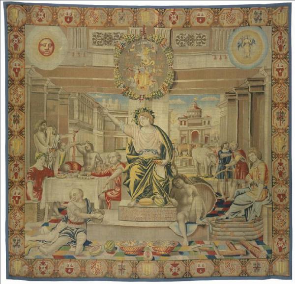 L'Agosto è caratterizzato dalla presenza della Vergine. La personificazione del mese è un giovane seduto, con il capo cinto di pampini e foglie di vite. Con la mano destra indica il sole e nella sinistra regge un recipiente. Poggia un piede su uno dei due meloni che giacciono sul gradino del sedile. Su questo gradino si legge l'iscrizione descrittiva del mese. Ai lati di Agosto vi sono tre figure: un bambino mollemente addormentato, un vecchio seduto per terra con un fiasco fra le mani e che osserva il fanciullo a lui vicino e dall'altra parte un giovane addormentato e seminudo. In primo piano vi sono due zucchine, due meloni, due recipienti pieni di uva, prugne e fichi, un mazzuolo, una pialla e tre fasci di vincastri. I tre personaggi nella parte destra dell'arazzo sono occupati nella fabbricazione di botti. La parte sinistra dell'immagine è occupata da una tavolata: un uomo e una donna volgono lo sguardo verso lo spettatore e indicano i commensali. L'intera scena si svolge in un ampio loggiato (di cui si vede anche il fronte, con fregi) al di là del quale si apre un piazzale dove si distinguono coppie di buoi aggiogati. Lo sfondo dell'arazzo è occupato da una fitta serie di architetture tra cui vi sono un edificio con tiburio dodecagonale e una facciata con arco trionfale.