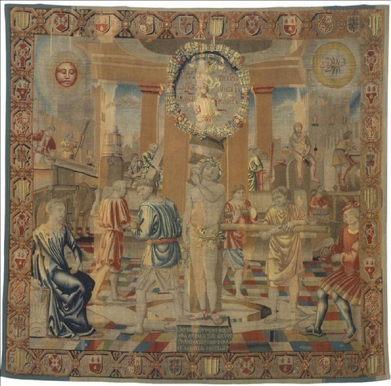- NOTIZIE STORICO CRITICHE La presenza di due segni zodiacali in questo arazzo è dovuta alla fonte cui attinge Bramantino: la xilografia dell'edizione di Ratdolt dell'Astronomicum di Igino, edito a Venezia nel 1482.\nLa personificazione del mese è intesa come una rappresentazione del dio Bacco (Suida, Valsecchi, Dell'Acqua-Mulazzani). Nonostante sia tradizionale l'interpretazione del mese di Settembre come il periodo della spremitura dell'uva, tuttavia è innovativa la soluzione compositiva basata sul palo verticale a spirale che marca l'asse centrale dell'arazzo (Forti Grazzini). La scena, sapientemente costruita dal punto di vista architettonico, è bloccata alle estremità da due figure nelle quali sono state riconosciute il Magno nelle vesti di uccellatore e sua moglie, Margherita Colleoni (Valsecchi).
