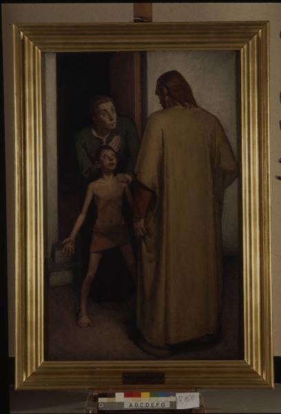 - NOTIZIE STORICO CRITICHE Angelina Scotti (nata in Paderno Dugnano nel 1870), vedova dell'industriale tessile Achille Perego, scompare in Milano il 19 aprile 1941, lasciando numerosissimi lasciti attraverso il suo testamento olografo redatto il 21 gennaio 1937, nel quale la benefattrice stessa chiarisce la motivazione dei suoi intenti: "La mia mente è rivolta alla memoria del mio caro defunto Achille perciò seguo i suoi desideri che mi aveva espresso durante la sua esistenza". Erede universale risulta l'Ospedale Maggiore di Milano, mentre l'Istituto dei Ciechi, quelli dei Rachitici, del Cancro e l'Ospizio della Sacra Famiglia per gli Incurabili di Cesano Boscone ricevono ciascuno un legato di centomila lire. La benefattrice ricorda anche la Galleria d'Arte Moderna di Milano destinando alle sue raccolte i dipinti di Angelo Dall'Oca Bianca di sua proprietà. Nonostante l'Amministrazione abbia richiesto una fotografia di Angelina Scotti Perego al notaio Antonio Colombi (in data 1 maggio 1941) per poter realizzare il tradizionale ritratto gratulatorio, successivamente Augusto Colombo, incaricato della sua esecuzione, decide di eseguire un ricordo allegorico della benefattrice, scegliendo come soggetto Cristo che guarisce il fanciullo cieco. Evidentemente gli eventi bellici hanno interrotto il lavoro del pittore, che ha ultimato la tela soltanto nel febbraio 1947.