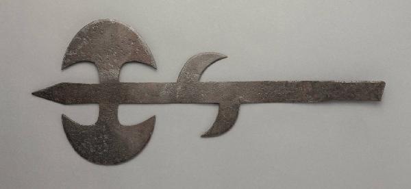 Oggetto in ferro a forma di scure bipenne costituita da una lunga asta rettangolare quasi piatta, dalla quale sporgono due denti ad artiglio sfasati e opposti. La punta del dente inferiore è direzionata verso la cuspide e quella superiore è direzionata verso la base. Superiormente, in prossimità della cuspide, che si espande leggermente fino a circa metà della sua lunghezza terminando a punta triangolare, due ali opposte di uguali dimensioni. La zona dell'impugnatura è leggermente rastremata. L'oggetto non presenta fili taglienti.