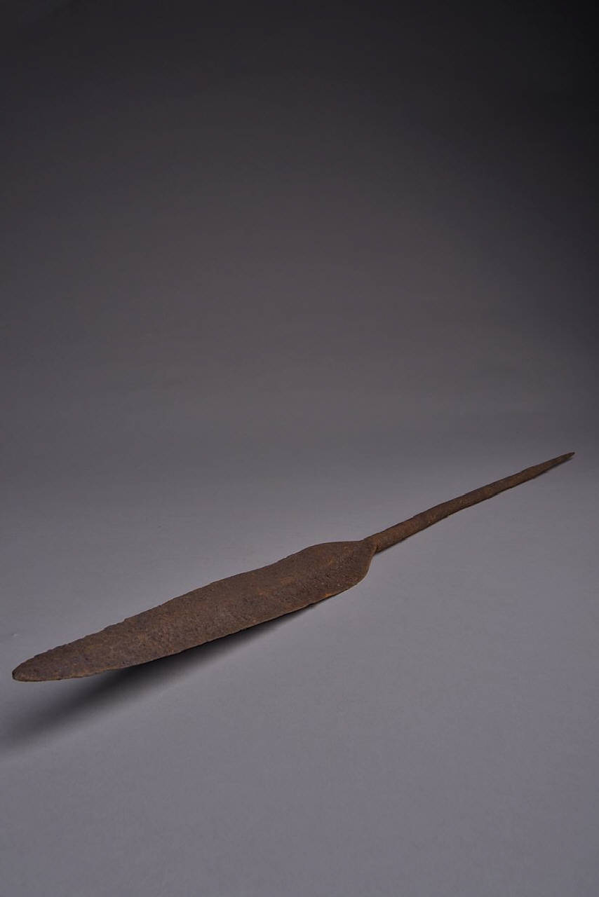 Ferro di lancia con piccola cuspide quasi triangolare, costolata, con lungo codolo appuntito.