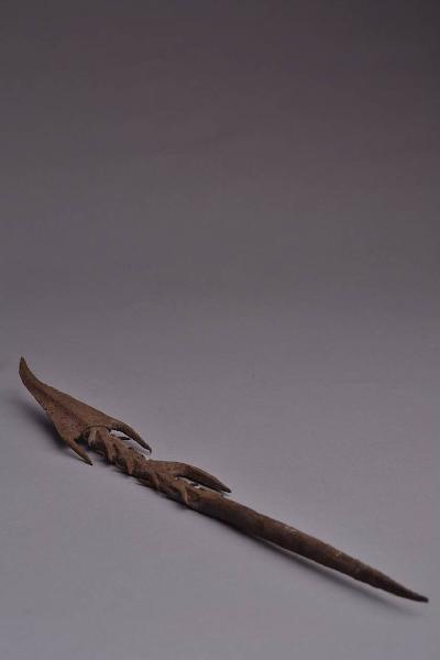 Ferro di freccia con cuspide piatta, triangolare a V rovesciato (tipo spiedo) con fondo terminante in due ali a punta rivolte verso il basso. Lungo collo, spezzato con grossi spuntoni che si incrociano fra loro a X nella zona vicino alla cuspide e nel mezzo un grosso dente appuntito incurvato verso il basso.
