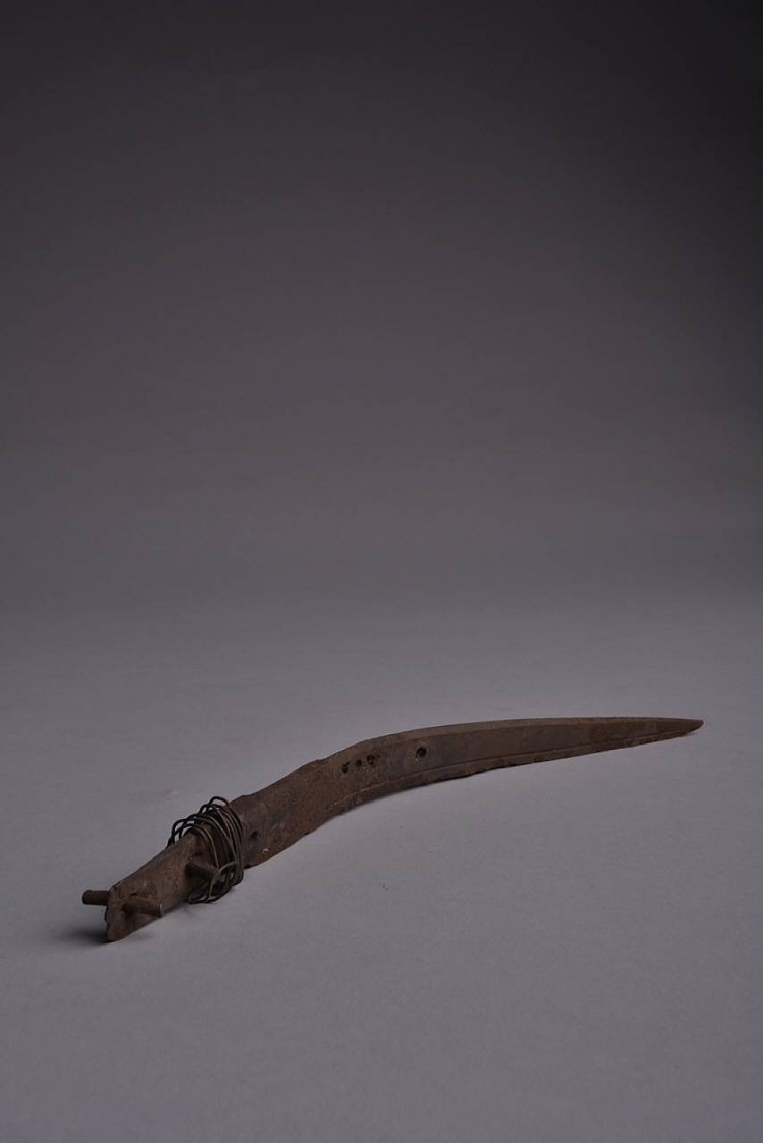 Lama semplice, dritta, a un taglio e punta acuta. Su un piano, all'altezza del forte, quattro incisioni in fila: croce, cerchio, croce, cerchio e alla base fra dorso e filo tracce di ghirigori. Una fine scanalatura scorre vicino al filo. Un codolo piatto con attaccati due rivetti che lo attraversano e tracce di filo metallico avvolto a spirale prosegue dal dorso della lama.