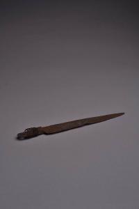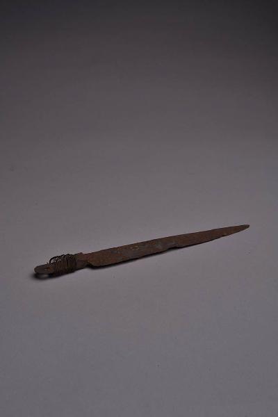 Breve codolo piatto che prosegue dal dorso della lama, con un foro alla base stondata e filo di ferro (?) arrotolato a spirale. Lama fine con filo al convesso e dorso piatto, terminante a punta aguzza. Dal tallone al medio un decoro di agemina d'argento a tratti sinuosi.