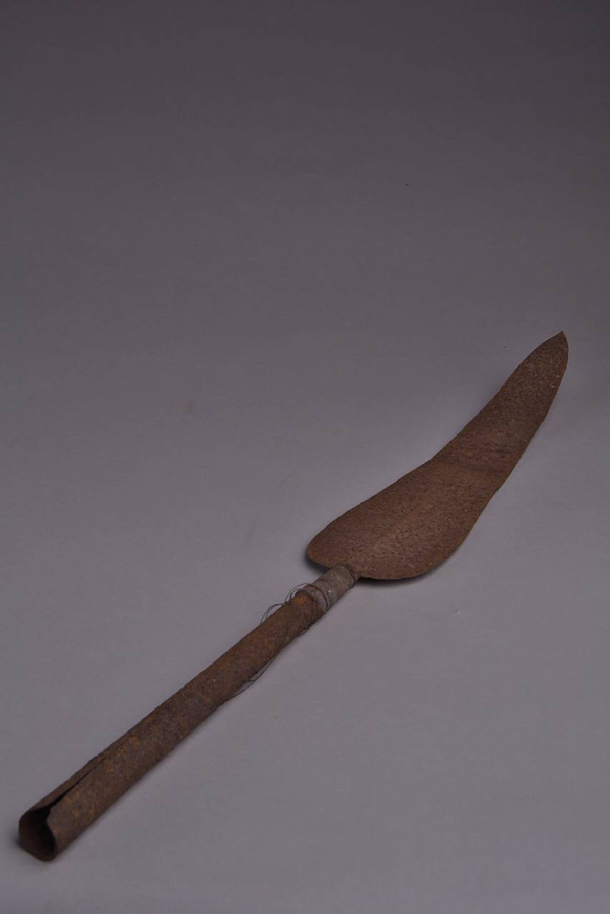 Ferro di lancia con cuspide a foglia leggermente nervata alla base, espansa e tondeggiante. Gorbia tubolare leggermente rastremata verso la lama. In prossimità di quest'ultima tracce di tessuto e spire di filo metallico.