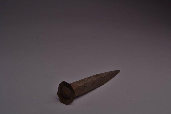 Grosso chiodo o cuneo di catena di sezione quadrangolare i cui lati piegano a due terzi della lunghezza convergendo a punta piramidale. La capocchia è incastrata in una breve porzione di lamiera circolare.