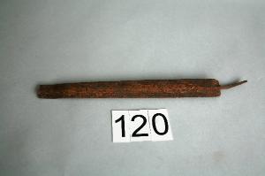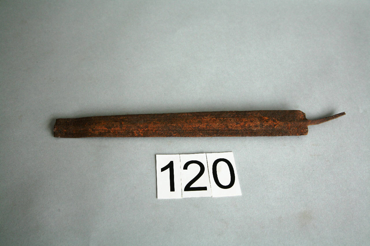 Piccola lama triangolare molto allungata con doppio filo convergente, che termina in una punta spezzata. Al centro della base del tallone, dritta, un breve codolo a spuntone storto. Lungo i fili due coppie di sottilissime scanalature decorative.