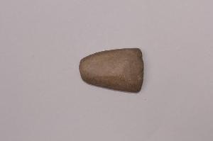 Ascia in roccia ignea. Forma trapezoidale, tallone arrotondato, tagliente arcuato, sezione piano-convessa.