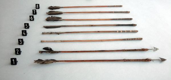 Freccia senza cuspide e con poche piume. Fa parte di un gruppo di 8 piccole frecce somale. Probabilmente quelle senza cuspide, non avendo il foro per ospitare il codolo, sono incomplete. La forma e la fattura sono uguali, ma sembra che il legno utilizzato sia diverso fra quelle con cuspide, che hanno una patina più antica, e quelle che ne sono sprovviste, che hanno invece una patina più chiara, dall'aspetto più recente.