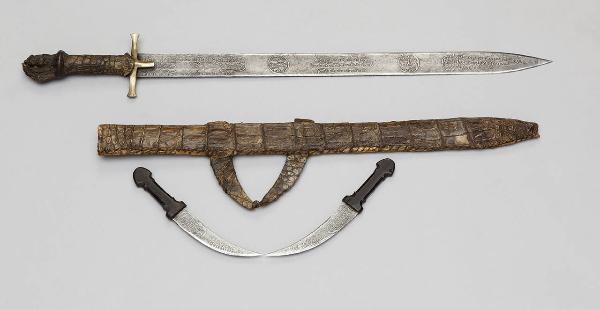Spada (kaskara) con lama dritta a due tagli, decorata a mordente con scritte su tutta la superficie. Elsa in ottone a croce con terminali espansi. Impugnatura in legno rivestita con pelle di coccodrillo e pomo formato da zampa mummificata. Fodero in pelle di coccodrillo, con due alloggiamenti dove sono inseriti due pugnali a lama curva decorata a mordente con impugnatura in legno. Spada con fodero in pelle di lucertola, si vedono testa, zampe del rettile. Lama ricurva ornata con pseudo iscrizione. Dotata di fodero e due jambiya.