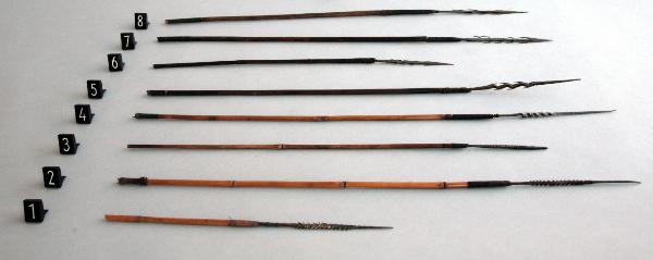 - NOTIZIE STORICO CRITICHE Secondo la descrizione che Spring (C. Spring, African Arms and Armours, British Museum Press, 1993.p. 103) fornisce delle armi dei Midgan (popolazione che vive nella regione Ogaden ai bordi sud orientali dell'Etiopia, confinanti con la Somalia), le loro frecce erano molto corte rispetto all'arco e avevano cuspidi spuntonate, con punte triangolari infilate a codolo in aste di legno, con piume di pollo guinea. In questo caso le frecce sono prive di piume, e la loro somiglianza con le lance AFR00206 e AFR00207 supporterebbe anche una provenienza dal centrafrica sudanico.\n\nRiferimenti:\nDr. F.Spesier, Etnographishe materialen aus den Neuen Hebriden und den Banes Inseln, Liechtenstein, Kruas Reprint Nendeln, 1979, pp. 49-53 (Prima edizione: Berlin, C.W. Kreidel's Uerlag, 1923).
