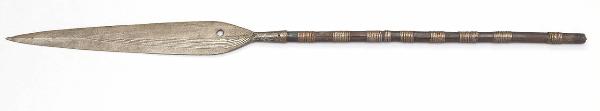 Gorbia troncoconica forata alla base e aperta da un lato. Decorazione attorno al collo incisa a zigzag. Piccole cuspide a freccia, con fili leggermente convessi, fine cresta centrale e leggere depressioni in corrispondenza del filo. Asta in legno scuro, lucido, con rigonfiamento a quattro quarti della lunghezza, terminante a punta. Breve gorbia conica aperta e forata all'opposto per poterla assicurare all'asta con un chiodo (mancante). Cuspide a foglia lunga e larga, con cresta che dal debole si biforca lungo i fili; al centro, nel forte, decorazione a colonna di brevi segmenti incisi a V; alla sinistra, una serie di sgusci digradanti verso il centro; alla destra un ampio foro dal bordo circolare zigrinato; i bordi inferiori della lama sono anch'essi zigrinati. Asta, in legno scuro, con rigature fini, fessurata per il lungo e mancante della metà inferiore; sotto la gorbia, avvolgimenti separati di piattina di ferro ad andamento sinistrorso.\n