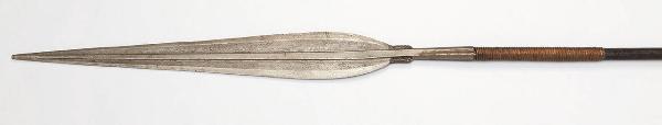 Grosso ferro congolese con gorbia ottagonale avente quattro facce più larghe, delle quali due proseguono nella cuspide formando una nervatura squadrata. Cuspide pesante a foglia molto larga e lunga, con breve base rettangolare schiacciata, decorata con motivi impressi a zigzag, che prosegue nel forte, a cucchiaio, con i fili che si stringono convergendo a punta aguzza. Due depressioni laterali, dal fondo graffiato, occupano quasi tutta la superficie della cuspide, delimitate dai bordi rialzati e dalla nervatura. L'asta, in legno annerito, è profondamente rigata per tutta la sua lunghezza e si espande verso la parte finale dell'asta, in corrispondenza di un avvolgimento di piattina crestata di rame; gli ultimi centimetri sono coperti da un avvolgimento d'ottone.