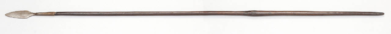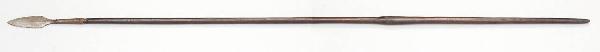 Gorbia troncoconica forata alla base e aperta da un lato. Decorazione attorno al collo incisa a zigzag. Piccole cuspide a freccia, con fili leggermente convessi, fine cresta centrale e leggere depressioni in corrispondenza del filo. Asta in legno scuro, lucido, con rigonfiamento a quattro quarti della lunghezza, terminante a punta.