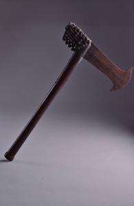 Ferro sottile quasi rettangolare, taglio frontale a mezzaluna con due apici appiattiti, perpendicolari al manico; una leggera cresta attraversa centralmente la lama, e su un piano vi è una larga iscrizione a puntini (sorta di ghirigori con una E finale). Manico tubolare in legno con espansione anulare alla base dell'impugnatura. Al retro della lama, una espansione a forma di parallelepipedo ospita il codolo che fuoriesce posteriormente ribattuto. Questa zona presenta scanalature zigzaganti su tutta la superficie e borchiette d'ottone, e il bordo in basso è intagliato a triangoli traforati sporgenti.