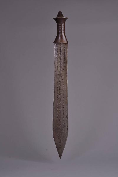Daga congolese? con impugnatura in legno duro, scuro, di forma circolare sagomata ad anelli, che si espande all'estremità superiore a tromba, a formare un pomo circolare dal bordo rastremato, con un bottone centrale conico dal quale spunta il codolo; all'altra estremità, l'impugnatura si espande a cono schiacciato. Lama a due fili, dritta al forte con profondo sguscio, posto leggermente a sinistra rispetto all'asse centrale, che termina a metà del medio. I fili, concavi nel medio, si espandono nel debole, poi convergono drasticamente a punta triangolare. Incisioni a puntini quadrati punzonati lungo tutta la lama.\nFodero (associato) in legno coperto da un sottile strato di cuoio, cucito e incollato, con espansione pressappoco circolare sul fondo; Un cordino di pelle pende a lato del fodero, nella zona centrale, annodato ad anello in due punti, mobili.