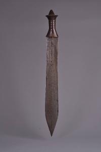 - NOTIZIE STORICO CRITICHE La provenienza di quest'arma non è chiara. La lama, pesante e dalla linea severa, ha una forma molto più semplice di quelle congolesi del resto della collezione, mentre le sue decorazioni sono comuni a più culture africane. La peculiarità evidente di questa daga è la forma del pomo. Sembra che essa appartenga a popolazioni africane molto distanti fra loro. Si può infatti notare la stessa linea in alcune armi dei Kuba (Ginzberg, p. 177), dei Pende (popolazione situata in Angola, ai confini col Congo, a sud dei Kuba, che usava tra l'altro gli stessi foderi con finale circolare) (Werner - Zirngibl, p. 140), ma anche nelle daghe dei Baule della Costa d'Avorio, i quali usavano per le impugnature un legno molto duro, simile all'ebano (Ginzberg, p. 182 e Werner - Zirngibl, p. 145). Tuttavia, una provenienza dalla Costa d'Avorio sembra improbabile, se si considera la collezione d'armi africane nel suo complesso. L'attribuzione congolese sarebbe anche supportata da altre fonti: una daga degli Nhutshu (bacino del fiume Congo), conservata al museo Pigorini, che oltre ad avere un'impugnatura simile, possiede un fodero della stessa forma di quello in esame, sebbene più grosso e robusto, e una daga più recente, dell'inizio del XX secolo, con le medesime caratteristiche, attribuita alla popolazione Yaka (a fianco dei Kuba, vicino al fiume Kuango che segue i confini fra l'Angola e il Congo), di un catalogo in rete (Oriental Arms).