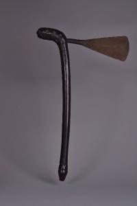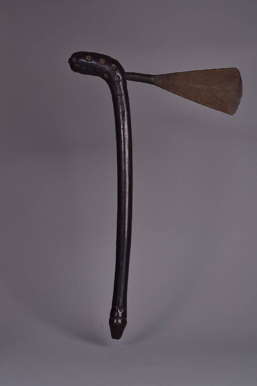 Ferro triangolare a filo frontale convesso, immanicato orizzontalmente tramite il lungo codolo circolare che attraversa l'espansione globosa, la quale curva superiormente al manico, terminando ribattuto all'estremità opposta. Manico in legno duro, scurito, leggermente curvo, decorato con 18 incavi ovoidali sull'espansione globosa. L'estremità inferiore presenta ulteriori piccole scanalature e termina con un'espansione anulare che si rastrema a cono.