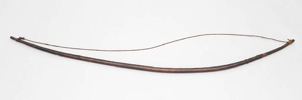 Arco in legno duro, chiaro, scurito e curvato al fuoco, grossolanamente rifinito, di sezione circolare con il profilo che si assottiglia alle estremità le quali presentano leggere tacche per permettere l'attacco della corda. Superficie scura con brandelli di pelle (?) attorcigliati. Corda in pelle e fibra vegetale viola, attorcigliati, ancora montata.
