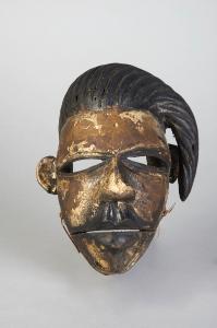 MASCHERA FACCIALE ANTROPOMORFA tinta in bianco (tracce di caolino) e con acconciatura e bocca tinte in nero. Gli occhi forati a mandorla attraversano tutto il volto fino ad arrivare alle orecchie sporgenti ad arco di cerchio. Il grande labbro superiore riprende nella forma il naso. Acconciatura asimmetrica con treccia laterale sinistra.