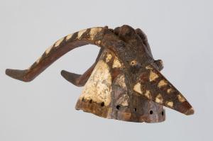 MASCHERA A CALOTTA - Maschera zoomorfa rappresentante un'antilope. La maschera legata a una calotta di fibre vegetali è posta sulla testa del danzatore come un copricapo e fissata al costume. Lo sviluppo orizzontale è caratterizzato dalle linee fluide delle corna, della cresta e del muso che attraversano la base semisferica della maschera e dalla decorazione policromatica bianco, nero, rosso a motivi triangolari, tipica della regione voltaica (Burkina Faso).