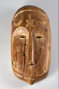 MASCHERA FACCIALE con fronte bombata, ampia arcata sopraccigliare e lungo naso diritto che attraversa il lungo volto, allargandosi in direzione della base. Sulla superficie incisioni di motivi curvilinei e rettilinei resi evidenti dalle tracce di caolino rimaste.