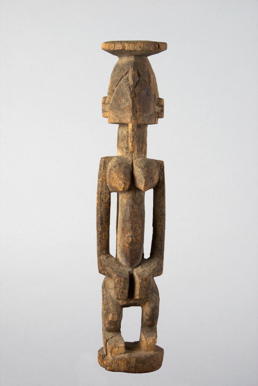 - NOTIZIE STORICO CRITICHE Le statue dogon sono utlizzate in contesti sacrificali e costituiscono di fatto degli altari. La loro funzione (W. E. A. Van Beek, Functions of sculpture in Dogon religion, in African Arts, Los Angeles, vol. 21, no. 4,1988) sarebbe quella di identificare colui che effettua il sacrificio e il problema che vuol risolvere, attraendo l'attenzione degli esseri soprannaturali e rafforzando il contatto con essi. Le statue vengono scolpite dai fabbri (alcuni dei quali sanno anche scolpire il legno) sulla base delle indicazioni tratte da un rito di divinazione che fa uso di conchiglie (cauri) o che interpreta le tracce lasciate dalla volpe sul terreno. Idealmente le sembianze della figura dovrebbero legarsi alla persona che ne farà uso anche se poi in realtà stile e iconografia sono convenzionali e una stessa statua può poi essere usata da più persone. Solo occasionalmente, quando il proprietario originario è deceduto e passa a un figlio, la statua può essere vista come una figura di "antenato". \nQueste statue hanno la funzione di veicolare la preghiera della persona che le possiede. La loro postura può indicare la posizione di preghiera (in ginocchio o con le braccia levate al cielo) oppure lo staus sociale che si vuole raggiungere o ancora una qualche rivelazione avuta in sogno.