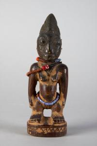 - NOTIZIE STORICO CRITICHE Le statuette ibeji rappresentano i gemelli. Presso gli Yoruba in epoca precoloniale la nascita dei gemelli era considerata une vento nefasto, un'intrusione dell'animalità nella sfera della riproduzione umana. Per questo i gemelli venivano abbandonati riconsegnadoli alla sfera della boscaglia da cui si riteneva provenissero. In tempi più recenti il significato si è capovolto facendone un segno benaugurante a dando vita a un culto dei gemelli. In caso di morte di uno o di entrambi i gemelli la madre fa scolpire queste statuette di cui si prende cura, lavandole, vestendole e nutrendole, perché depositarie dello spirito dei bambini defunti. Alla sua morte verranno trasmesse a una delle figlie. I gemelli conservano comunque un lato oscuro: il culto che si rivolge loro serve a placarne lo spirito.